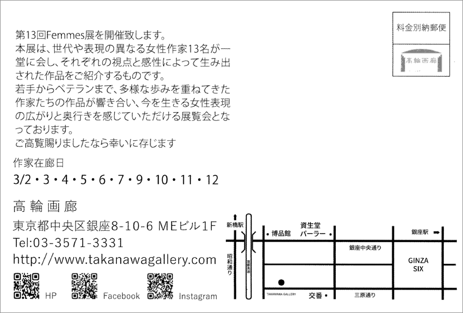 第13回 Femmes展 ③ 同人のグループ展 2026.02.28 Femmes(ファム)とは「女性・婦人・女子」の意。ヴェロン會同人の小林真由子、嶋村有里子、三岸節子が出品します。 2026年3月2日(月)ー3月12日(木) 日曜休廊 高輪画廊 大山智子 岡田菊惠 旧野ハナ 小林真由子 嶋村有里子 高瀬あおい 張麗寧 照山ひさ子 古田恵美子 宮田みな美 吉田素子 横山芙実 三岸節子(五十音順・敬称略)